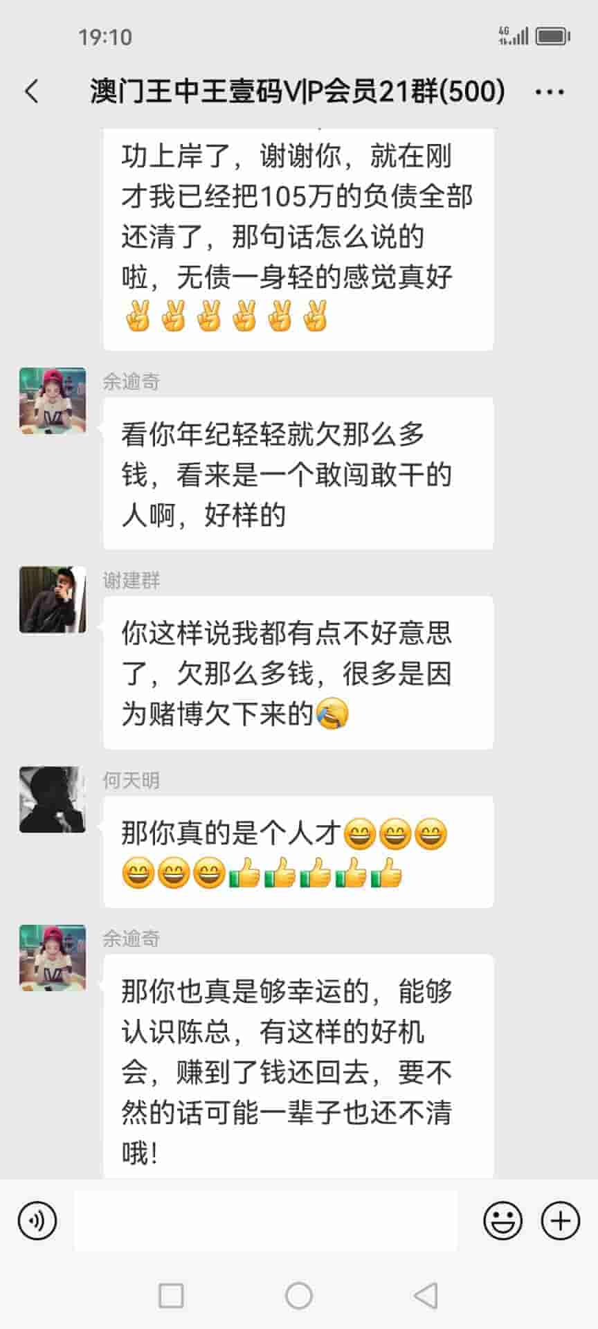 发表于39天前 陈总晚上好,跟着你的一码三中三到现在欠亲戚朋友的钱都已经还清了,昨晚又中了十几万,从今晚开始赚多少钱都是我自己的了,刚刚给您转了两万元红包,希望陈总不要嫌弃。 |